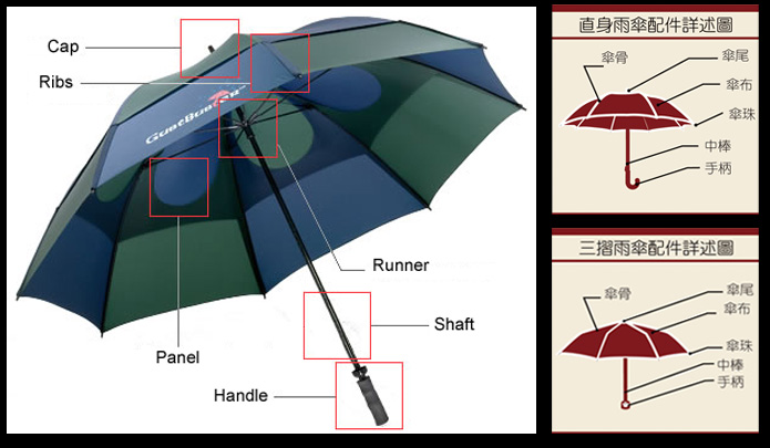 广告雨伞手柄(Umbrella Handle):手柄以弯形或直身最为常用。直柄通常配在较大的广告雨伞上,例如半径27"以上的高尔夫球雨伞(Golf Umbrella)或太阳伞。手柄的物料有5种最为常用: 塑料、木、橡胶、EVA、铝。