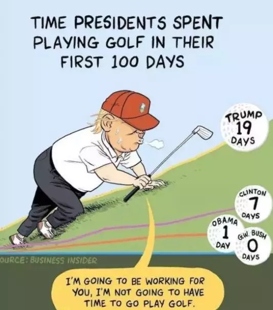 当任期前100天内,痴迷高尔夫的奥巴马仅有一次出现在高尔夫球场;老布什总统在任期的前100天没有打过高尔夫。比尔·克林顿在同样的任期内打了七轮高尔夫。而特朗普是19次,比他们个人加起来都多!